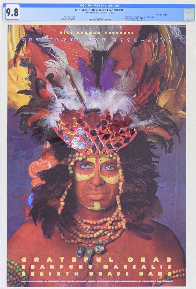 This Grateful Dead original poster was created for the December 31st 1990 New Years Eve show with Branford Marsalis at Oakland Coliseum. The design was created by artist Arlene Owseichik. Jazz legend Branford Marsalis performed all of set 2 with the Dead and the entire show was also an FM broadcast nationwide.