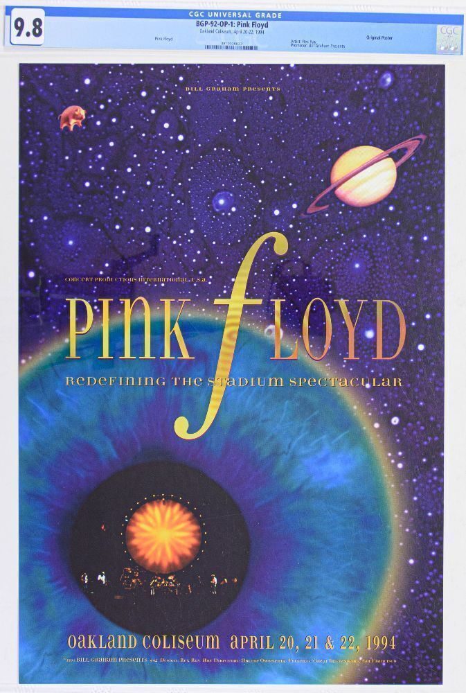 Artist Rex Ray designed a fabulous image for a run of shows featuring Pink Floyd at Oakland Coliseum in April 1994. These concerts were part of the group's FINAL TOUR, supporting the Division Bell album release. They performed Dark Side of the Moon in its entirety during some shows of the massive world tour. Pink Floyd is one of those 1960s bands that has widespread, worldwide appeal and fan base. Because the band was so huge, a relatively small amount of concert posters were issued, as the band didn't really have trouble selling tickets. As such, their posters are hotly contested at auction.