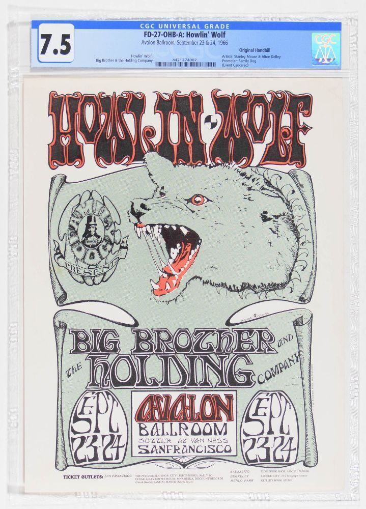 This is the FD-27 Original, Pre-Concert First Printing Handbill. The issue was only printed before the concerts (there are no reprints), which makes them especially desirable and valuable. This powerful image for a canceled Howlin' Wolf & Big Brother run of shows at the Avalon features another classic Mouse/Kelley design. The shows themselves were canceled but this classic image has remained a popular and important collectible in the series. This lot exhibits a great opportunity to add this showstopper handbill to your Family Dog collection!