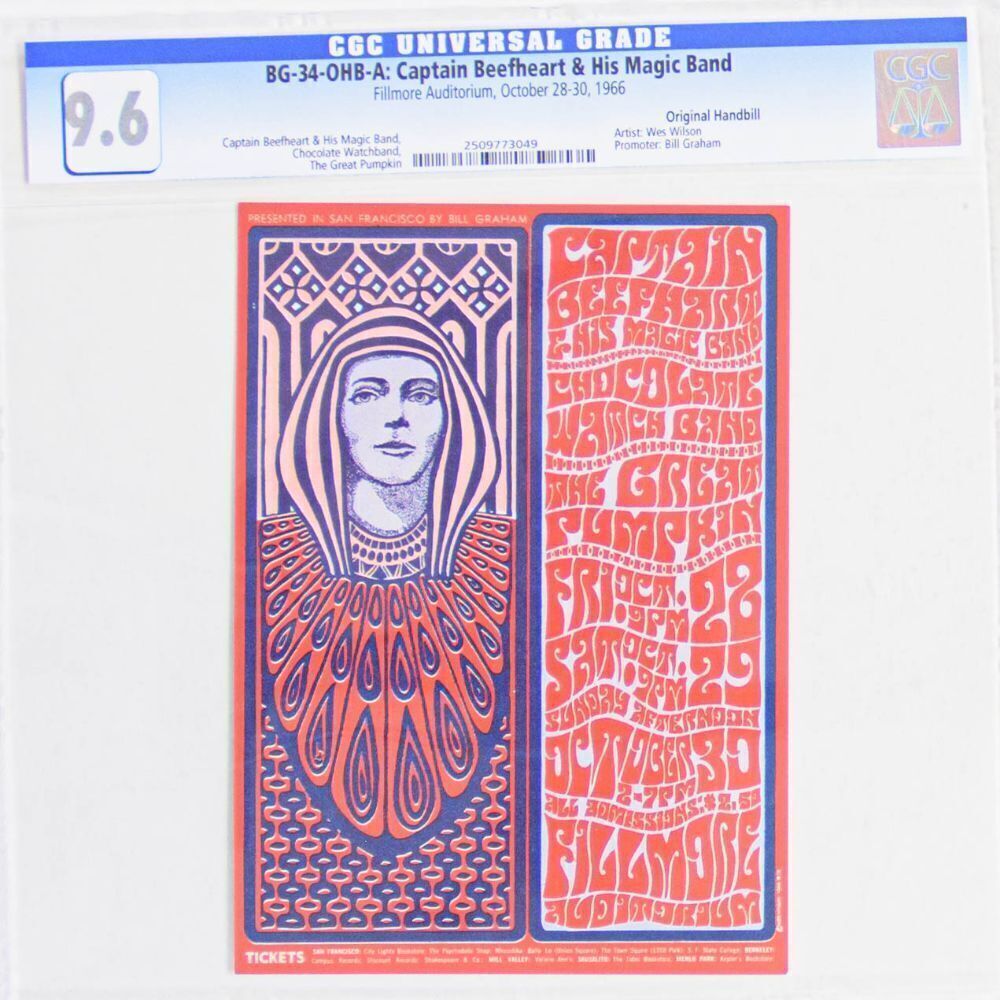 This Original Handbill features Wes Wilson's stunning advertisement for a performance by the enigmatic Captain Beefheart and His Magic Band at the Fillmore, and this is an early Fillmore favorite.