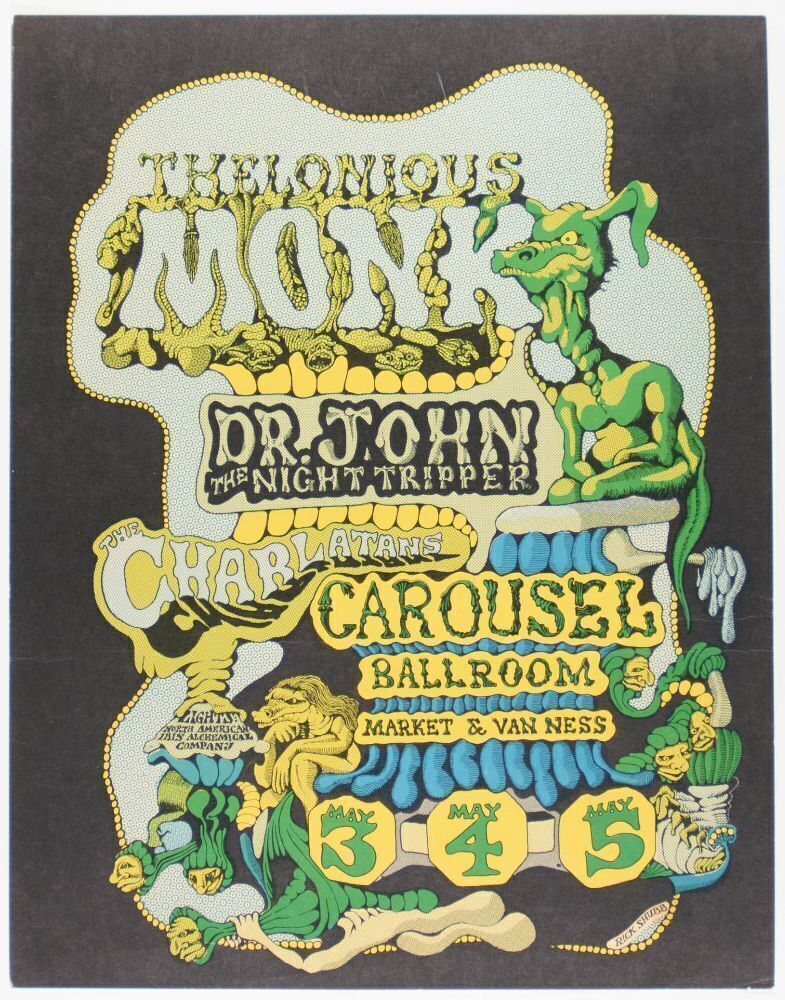 Here's just a wonderful cartoony, yet very psychedelic piece! This poster by artist Rick Shubb announced three performances by the incomparable innovator Thelonious Monk at the legendary Carousel Ballroom. The late great Dr. John and The Amazing Charlatans were in support.