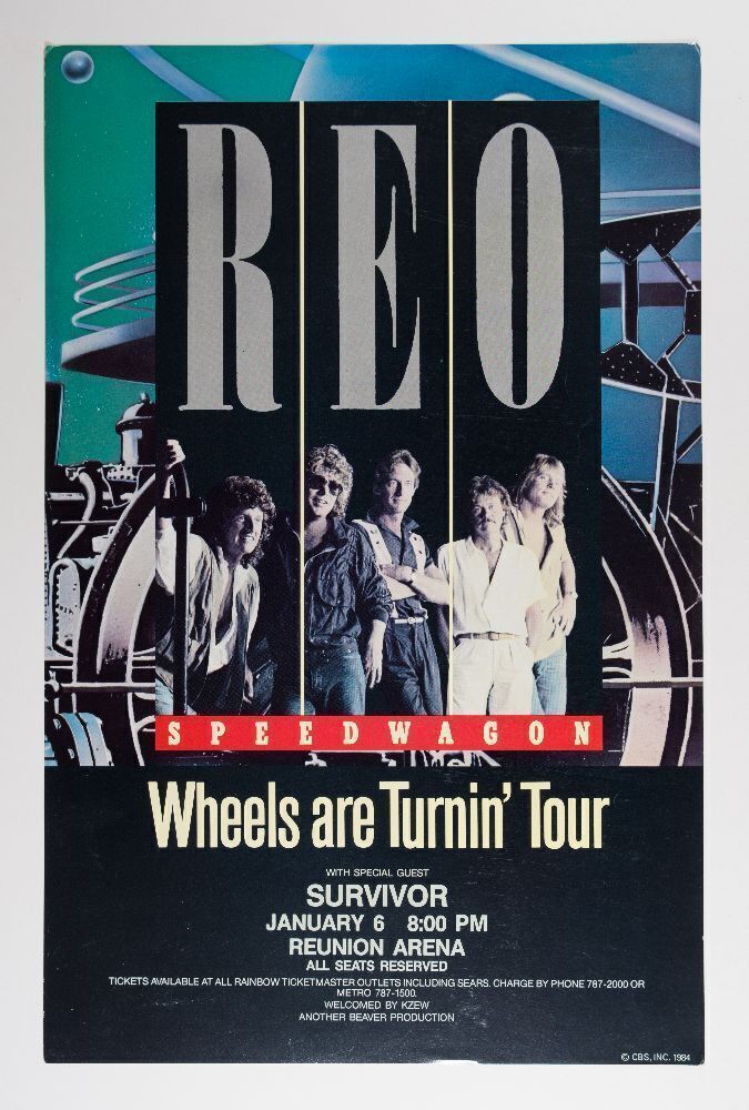 "Wheels Are Turnin'" is the eleventh studio album by American rock band REO Speedwagon, released in November 1984. It includes some of their most well-known hits, with "Can't Fight This Feeling" becoming one of their biggest singles, reaching number one on the Billboard Hot 100 chart. This poster promoted a stop on the tour supporting the album at the Reunion Arena in Dallas, Texas on January 6th, 1985.
