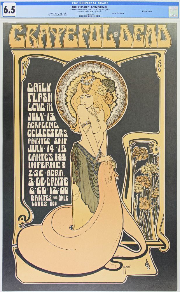 For this July 1967 Grateful Dead concert at Vancouver's Agradome poster artist Bob Masse pays homage to both Art Nouveau's Alphonse Mucha as well as classic pinup artwork. Canadian artist Bob Masse is one of rock's most seasoned and prolific poster artists. This is one of the most SCARCE and popular Grateful Dead posters ever created. We haven't auctioned a CGC-graded first-printing printing example since 2021. This is just the second SIGNED CGC-graded first printing to ever appear in our auction!