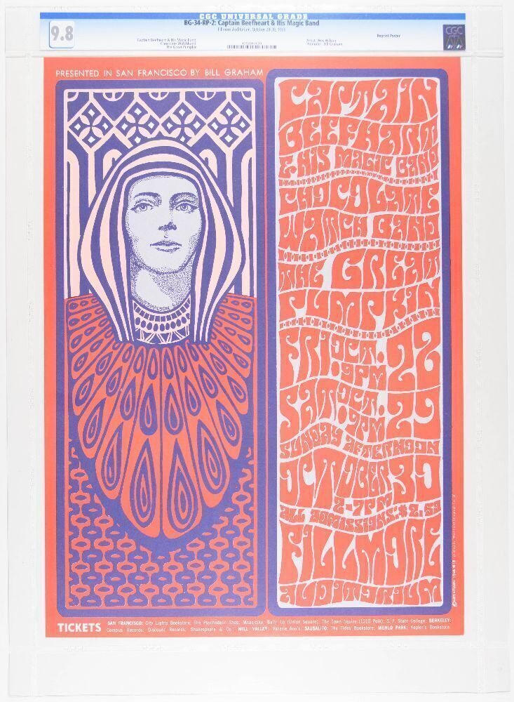 This is a second printing of Wes Wilson’s stunning advertisement for a performance by the enigmatic Captain Beefheart and His Magic Band at the Fillmore, and this is an early Bill Graham favorite. This is an early Fillmore favorite and even the second printings are quite collectible.