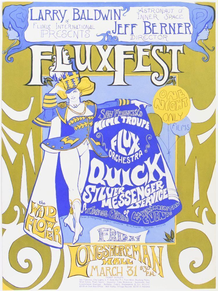 This original poster was created for the Flux Fest. The Flux Fest was a multi-media event presented at Longshoreman Hall in San Francisco in 1967. This one time happening included performance art, poetry, film, music and general artistic improvisation. The night ended with a dance concert by Quicksilver Messenger Service & The Wildflower.
