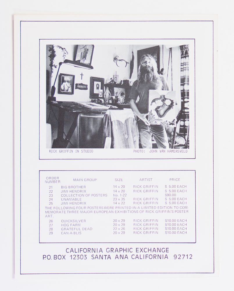 California Graphics Exchange was artist Rick Griffin's poster publishing company in the 1970's. This is the second catalog released by the company released to sell posters to interested fans. The reverse of the catalog features a photo of Rick in his studio taken by fellow poster artist, John Van Hamersveld!