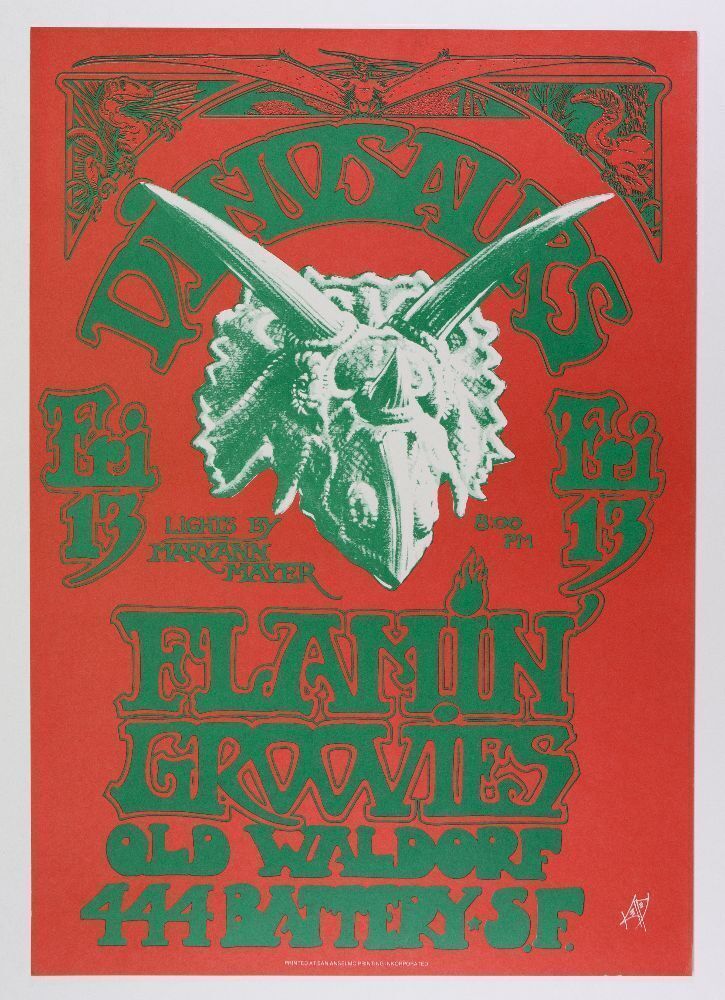 The late great Alton Kelley designed this original poster for The Dinosaurs and their appearance on August 13th 1982 at the Old Waldorf in San Francisco. The Flaming Groovies were in support. This is part of a numbered series of nine posters produced in 1982 and 1983, plus at least five other posters not numbered.