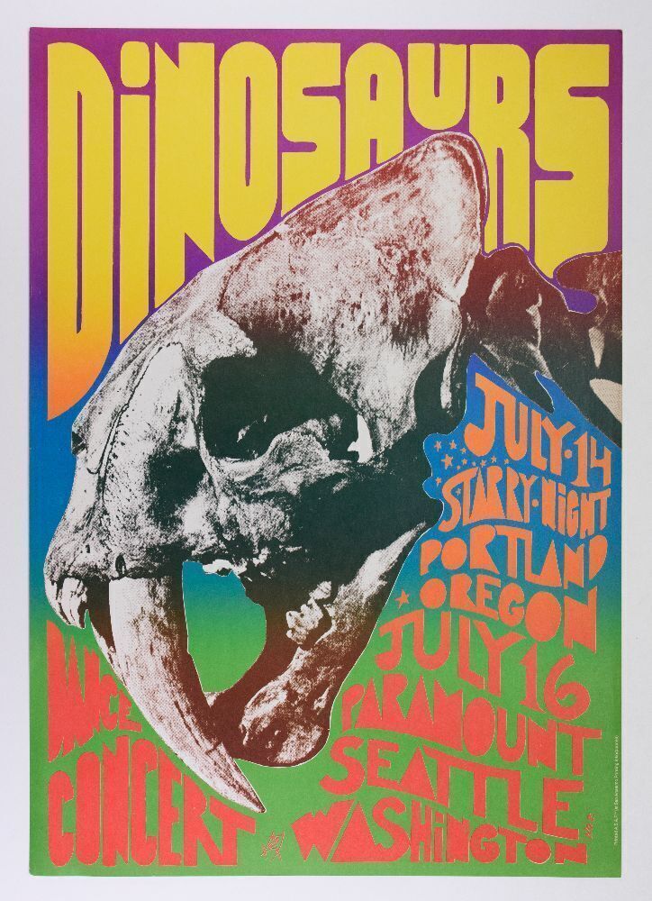 The late great Alton Kelley designed this original poster for The Dinosaurs and their first appearances in the Pacific Northwest for concerts in Portland and Seattle during 1983. This is the #8 issue in part of a numbered series of nine posters produced in 1982 and 1983.