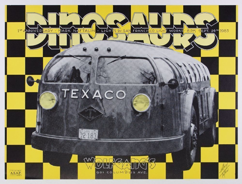 Alton Kelley & Randy Tuten designed this original poster for The Dinosaurs and their appearance at Wolfgang's in San Francisco during 1983. The Dinosaurs formed in 1982 and were a Bay Area Supergroup to emerge from the psychedelic music era of San Francisco. The core group consisted of Peter Albin of Big Brother and the Holding Company, John Cipollina of Quicksilver Messenger Service, Spencer Dryden of Jefferson Airplane, Robert Hunter of the Grateful Dead, Barry Melton of Country Joe and The Fish, and Country Joe himself.