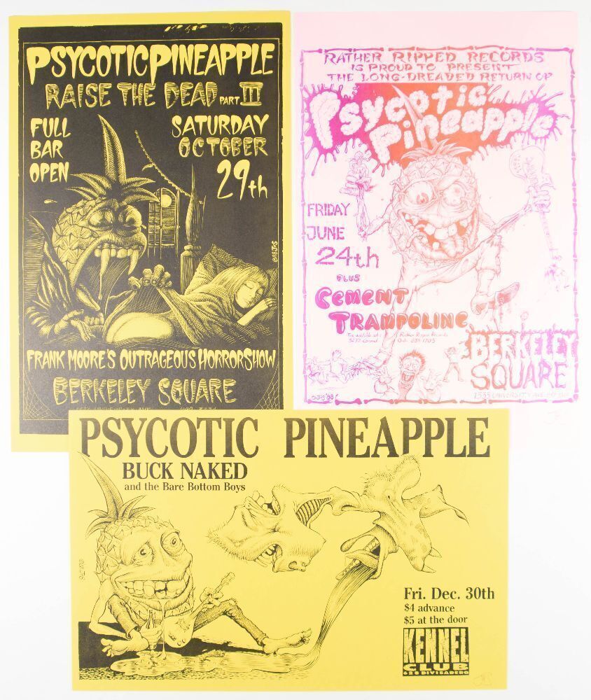 Berkeley's own garage rock / new wave band Psycotic Pineapple are featured on these items. An entire series of eye-catching flyers, handbills and cards were designed for many of Psycotic Pineapple's concerts by original band member John Seabury. Most were cartoon drawings and often contained the group's mascot PynoMan exhibited in a variety of strange trippy and comical situations.