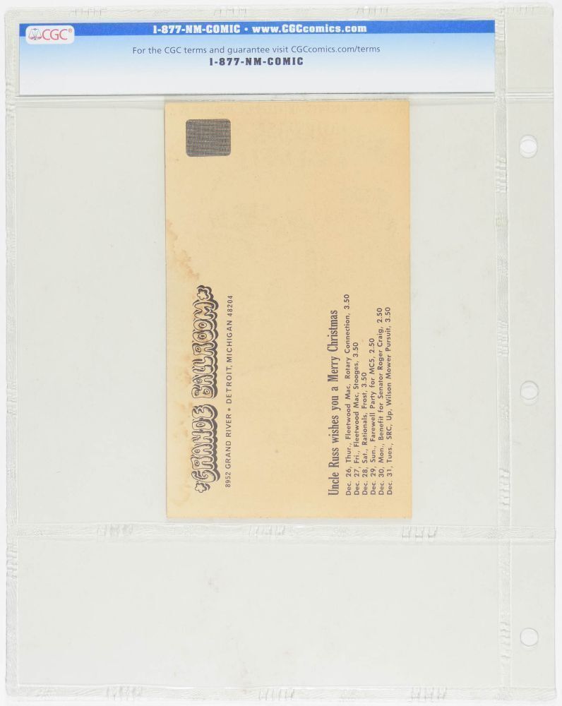 This Original Postcard features Iron Butterfly, SRC, and The New York Rock & Roll Ensemble playing at The Grande Ballroom in December 1968. The Grande Ballroom series produced some of the finest imagery from the 1960s music scene. In many cases, promoter Russ Gibb chose to only produce postcards to promote events. That being the case, Grande cards and card sets have become one of the most highly sought-after items by serious collectors.
