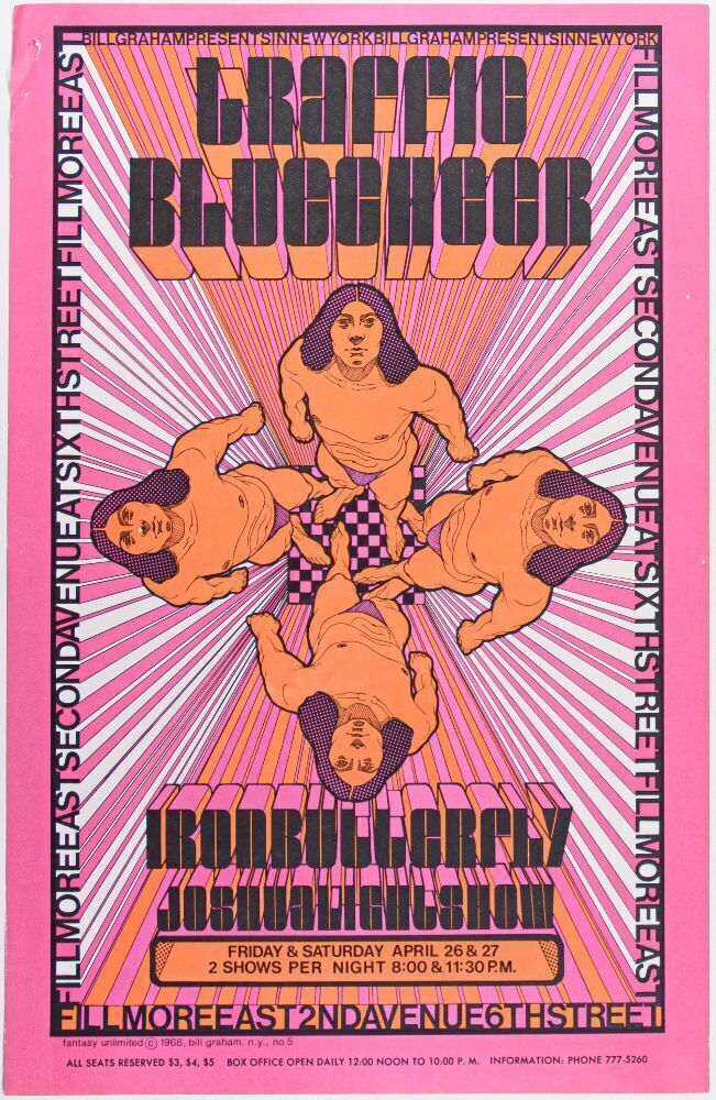 There were relatively few posters produced for Bill Grahams East Coast Venue, The Fillmore East. Instead, the promoter produced Playbill-style programs. This difficult-to-locate FE poster was for an appearance by Traffic in 1968, which fell in between their first two stellar albums. Blue Cheer and Iron Butterfly were in support. The image was designed by artist David Byrd.