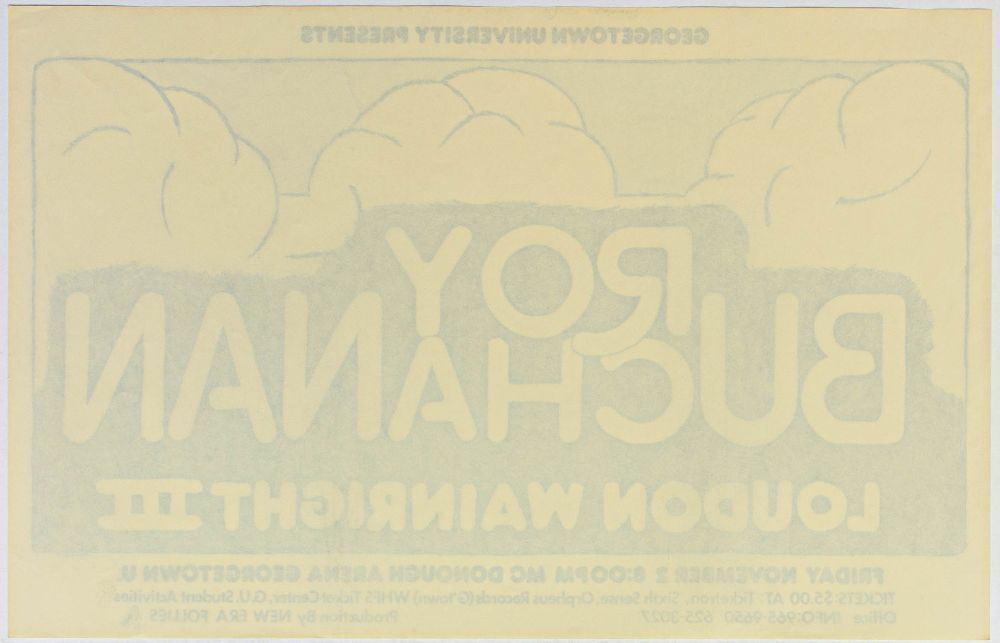 This poster announced Roy Buchanan and Loudon Wainwright III appearing at McDonough Arena at Georgetown University on November 2nd, 1973. Buchanan never enjoyed great commercial success but is considered one of the most influential guitarists of all time. The admired musician died tragically in 1988 at the age of 49. This poster remains in MINT condition more than 50 years later!