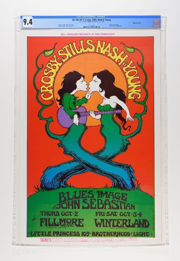 This Greg Irons original concert poster, for a run of canceled Crosby, Stills, Nash and Young Fillmore West & Winterland performances, is one of the artist's most popular and well-designed contributions to the series. It's also one of the most popular poster images from the 1960's. It rarely surfaces in our auctions in decent condition, so collectors will tend to scoop them up when they do appear.