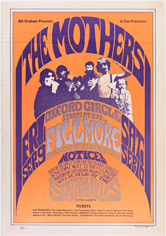 A rare example of the original first printing BG-27 poster from the Fillmore Auditorium & Scottish Rites Temple. The Mothers of Invention were a groundbreaking musical force in the 1960s. Frank Zappa the founder of the Mothers was a true musical innovator and a larger-than-life public figure. Zappa is one of those artists with worldwide appeal and this poster is one of our most requested pieces. This Original First Printing was designed by John Myers.