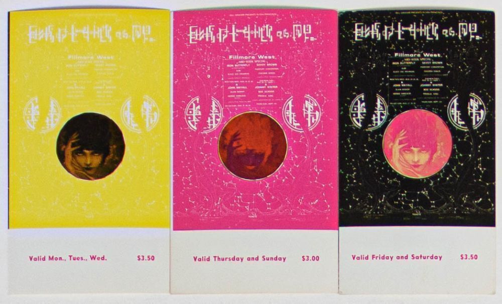 These original tickets were created for a handful of shows that were part of a two-week run in the summer of 1970 at the Fillmore West featuring Iron Butterfly, Johnny Winter, John Mayall, the Herbie Hancock Sextet, Freddie King and more. The image has incredible psychedelic/deco styling from the pen of the late great Alton Kelley.