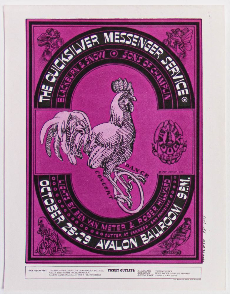 A popular Avalon Ballroom Original Handbill from 1966! The Chicken on a Unicycle is a very early Victor Moscoso design and it was the artist’s second contribution to the Family Dog series. Moscoso was one of the original "Big Five" artists and his work is highly praised within the art world.