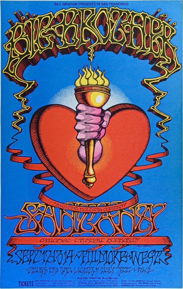 The Heart and Torch is one of Rick Griffin's most famous images. Experienced collectors and newbies alike LOVE the beautiful colors, killer lettering, and symmetrical design of this incredible work of art by the master of the genre. Janis was obviously part of Big Brother when the original artwork was created for this run of Fillmore West shows. This intensely fantastic concert poster is an internationally popular Rick Griffin concert poster artwork, appearing in most concert poster books featuring music concert & psychedelic posters from the Sixties. It was produced during the peak of Rick Griffin's quintessential psychedelic poster artwork period, published to promote the upcoming concerts, which were held just about a month following the release of Big Brother's second LP.