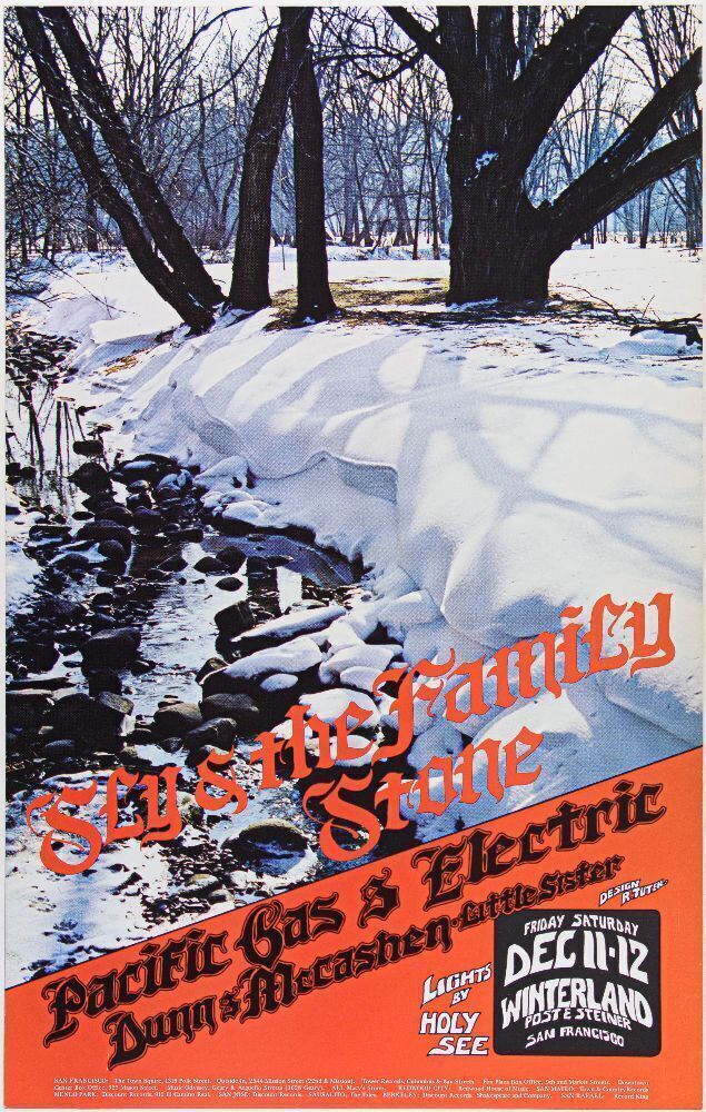 Here's a Randy Tuten issue that we have never offered in our auction until now! It advertised Sly & The Family Stone at Winterland in San Francisco on December 11, 1970. Pacific Gas and Electric, Dunn & McCashen, and Little Sister filled out the bill. 100% original with no restoration!