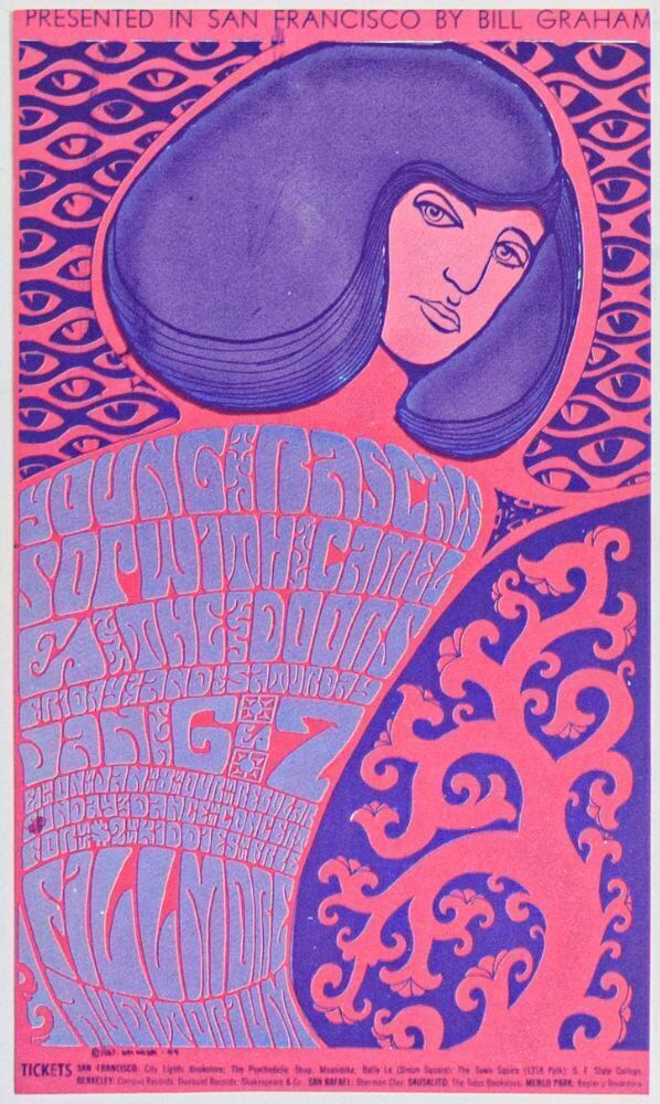 This 1967 Original Handbill announced The Doors' first appearance at the Fillmore. The artist, Wes Wilson, often incorporated the female form in many of his Fillmore designs, with his wife Eva serving as the model.