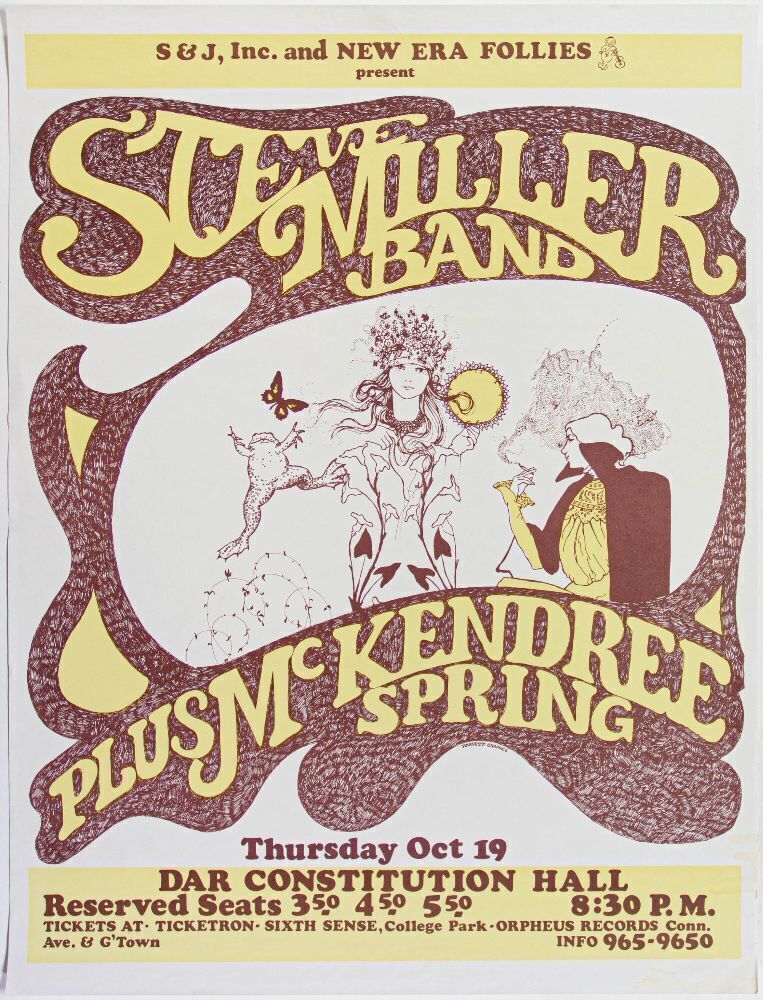 This vintage original concert poster announced the Steve Miller Band appearing at D.A.R. (Daughters of the American Revolution) Constitution Hall in Washington, DC on October 19th, 1972. Steve Miller (aka "Gangster of Love") began his performing career in 1965 in Chicago when he formed the "Goldberg-Miller Blues Band", which morphed into the Steve Miller Blues Band, which he formed in San Francisco in 1967, and with many changes in his band personnel over the years, is still gigging today, 57 years later, leaving a very long trail of many hit tunes & albums! Steve Miller Band's debut LP "Children of the Future" was released in 1968 by Capitol Records and featured an electrified full-color cover created by Victor Moscoso. In 1972, the band's double album compilation "Anthology" was released, featuring 16 songs from the band's first six of seven albums.