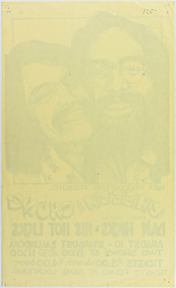 This poster announced the legendary stoner comedy duo Cheech & Chong appearing at the Stardust Ballroom in Los Angeles with Dan Hicks & His Hot Licks on August 10th, 1975. The artwork was created by Ken Featherston.