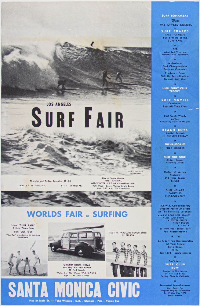 The Beach Boys were a major force in American popular music. The songwriting skills of the late great Brian Wilson are well-admired by fans of every generation. This poster for the Los Angeles Surf Fair in 1962 announced an early appearance by the band, just a year after they formed. The band wouldn't achieve their first national hit until the following year with "Surfin' USA". The event also featured surf movies, boards, art, and photography. We've never seen another example of this poster!