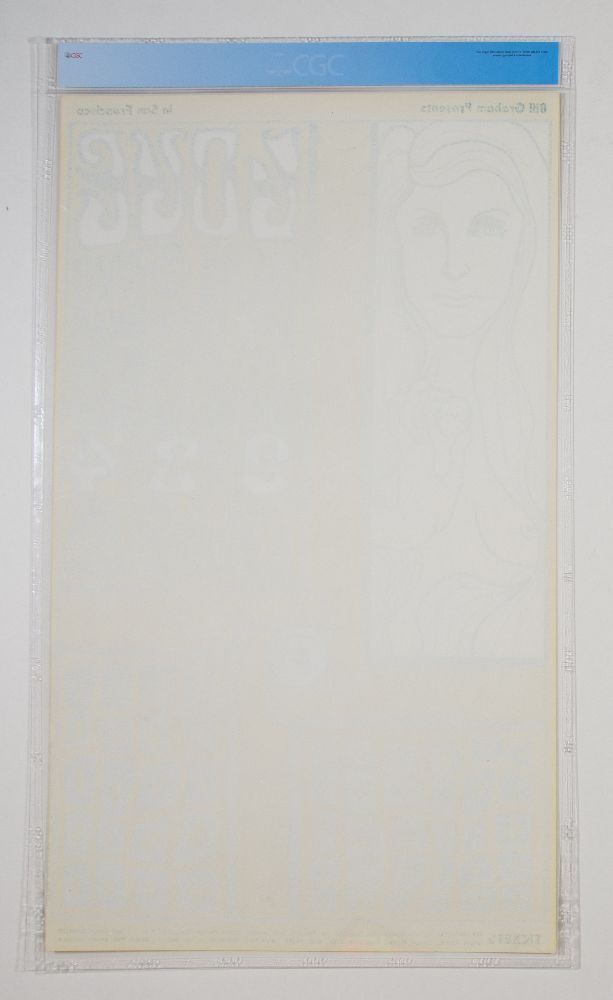 This lovely Wes Wilson design is one of his early works that celebrate the feminine form. His model was his wife at the time she notably appears in many of his posters in the Fillmore series. A beautiful image from 1966 announcing a San Francisco appearance of the amazing Arthur Lee and Love. This is the OP-3 version, pre-concert original printing. In July 2023 we auctioned another signed example of this poster for $3,300.00!
