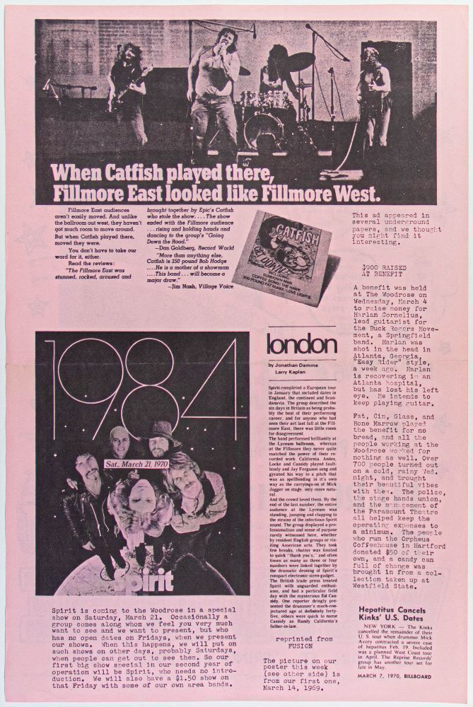 This RARE original poster features Catfish appearing at The Woodrose Ballroom in Springfield, Massachusetts on March 13th, 1970. Frost was in support. Singer and guitar player Catfish Hodge formed the band "Catfish", who performed in the 1960s and early 70s Detroit rock scene, opening up for acts like Bob Seger, Black Sabbath and Ted Nugent. They also played the Fillmore West in 1970 (BG-232).
