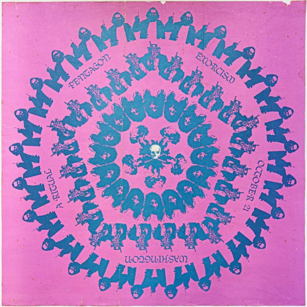 This rare poster from 1967 features artwork by Peter Legeria and announces "A Ritual. Pentagon. Exorcism. October 21. Washington". This was in reference to the historic Pentagon March, which took place in Washington, DC as a large-scale anti-Vietnam War protest. The rally drew over 100,000 attendees and became a crucial historical moment for the 1960s countercultural movement. The design for this poster features Allen Ginsberg, Uncle Sam, a Native American, and a skull amidst mushroom clouds in a mandala shape. This is an extremely scarce item that we've never handled before from an historical event!