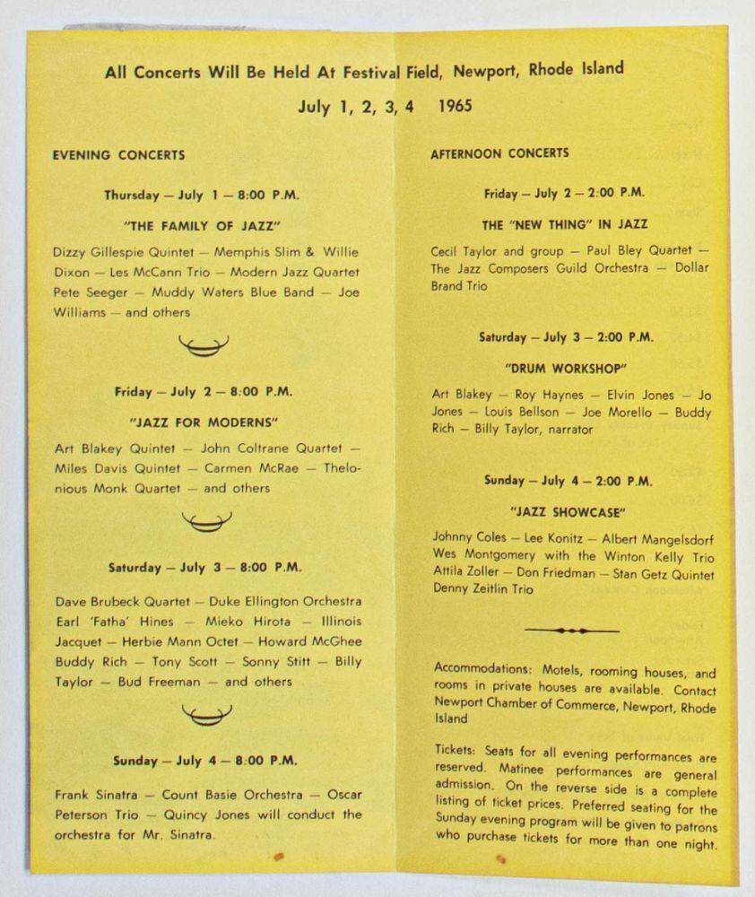 This double-sided fold-out ticket order form mailer was produced for the 1965 Newport Jazz Festival, held in Newport, Rhode Island, for four days in early July. The festival boasted a stacked lineup of jazz greats, including John Coltrane, Miles Davis, Art Blakey, Thelonious Monk, Dizzy Gillespie, Dave Brubeck, and many more. A unique item we've never offered in our auction before!