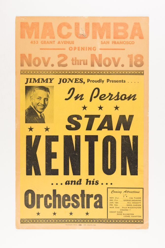 This RARE cardboard issue prmoted Stan Kenton and His Orchestra playing at The Macumba Club in San Francisco for a lengthy residence in November 1956. These famous shows were recorded and released as a live album in 1991. Kenton came to prominence in the 1940s and carved out a distinctive space in the jazz world with what he called "progressive jazz." His career spanned nearly 50 years.