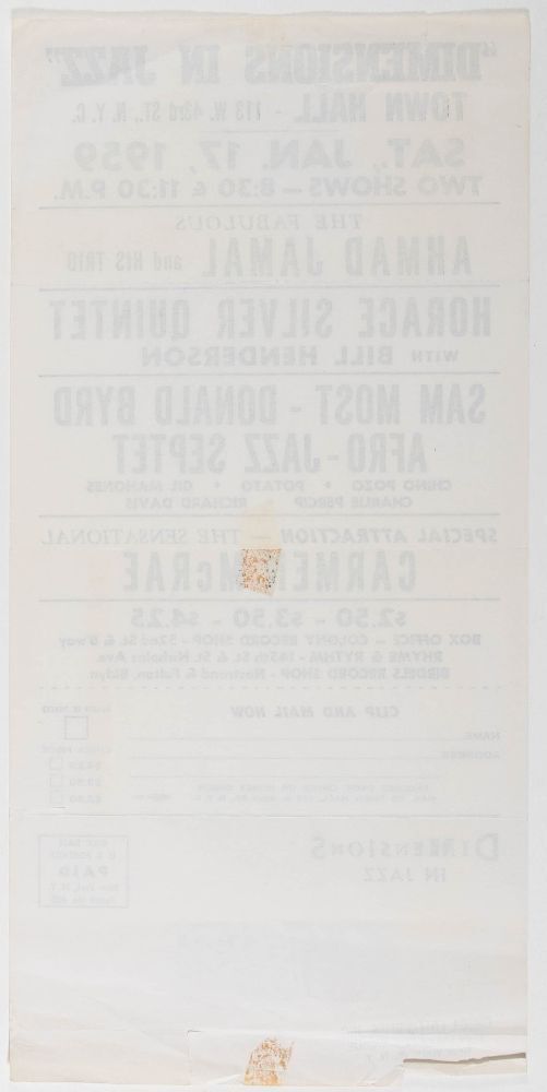 This ticket order form mailer was created for "Dimensions in Jazz", a show held at Town Hall in New York City on January 17th, 1959. The lineup of artists included The Ahmad Jamal Trio, Horace Silver Quintet, Sam Most, Donald Byrd, and Carmen McRae! McRae was one of the most distinctive and respected jazz vocalists of the 20th century. A rare piece of jazz history!