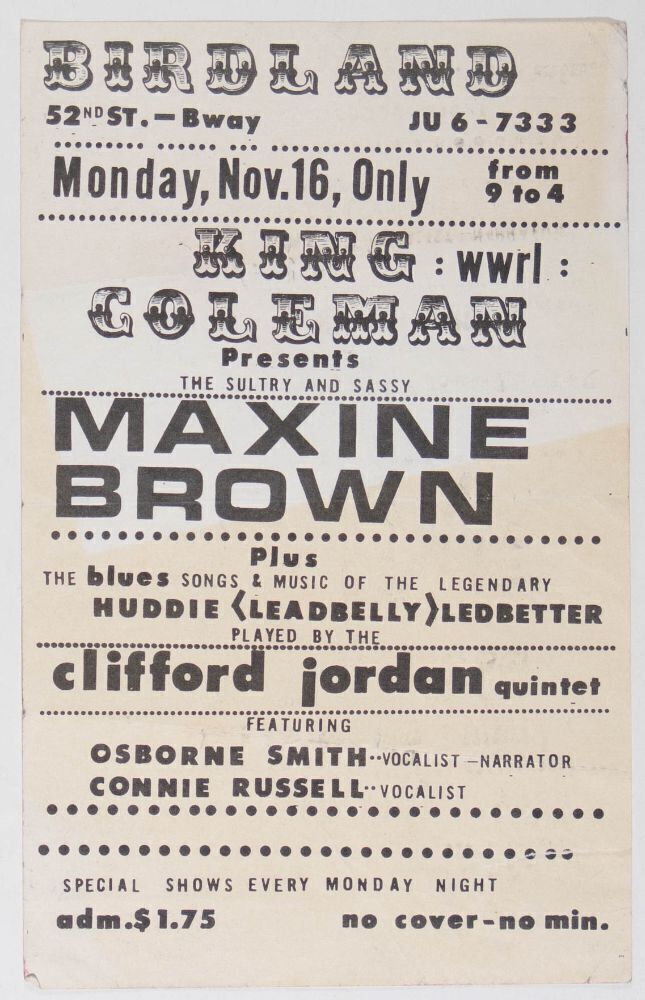 This handbill announced Maxine Brown and The Clifford Jordan Quintet appearing at the one and only Birdland on November 16th, 1964. Birdland was a famous jazz club on the legendary 52nd Street, the Jazz epicenter of New York City. The club opened in 1949 and regularly hosted many of the greatest names in jazz, including Charlie Parker, John Coltrane, and Count Basie, and was referred to as “both a cultural vantage point and a barometer of trends where all the big names in jazz performed” by Allan Morrison, editor of Ebony Magazine. The club's original tenure came to an end in 1965, but it reopened in a new location in 1986 and remains active to this day.