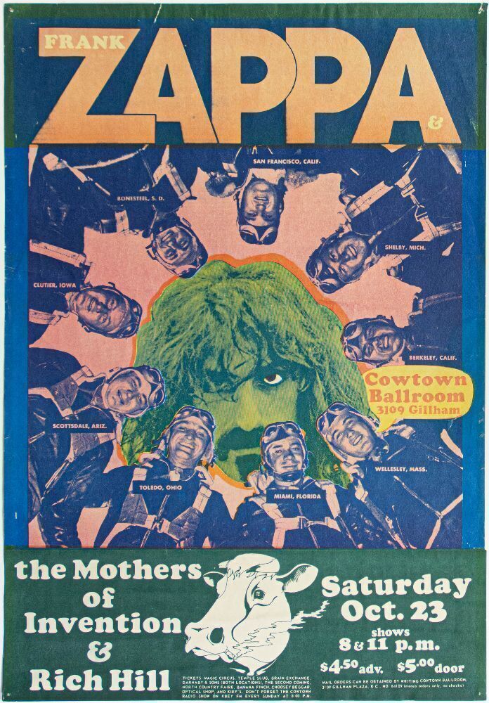 This rare poster announced Frank Zappa & The Mothers of Invention's performance at The Cowtown Ballroom in Kansas City, Missouri, on October 23, 1971. The show was part of the massive 1971 Mothers of Invention Tour, which included the legendary Fillmore East Shows featuring Flo and Eddie. The Fillmore concerts were the zenith of the Mothers' musical comedy brilliance. Mudshark Baby! The band played two shows on this night, an early show and a late show, which featured two entirely different setlists.