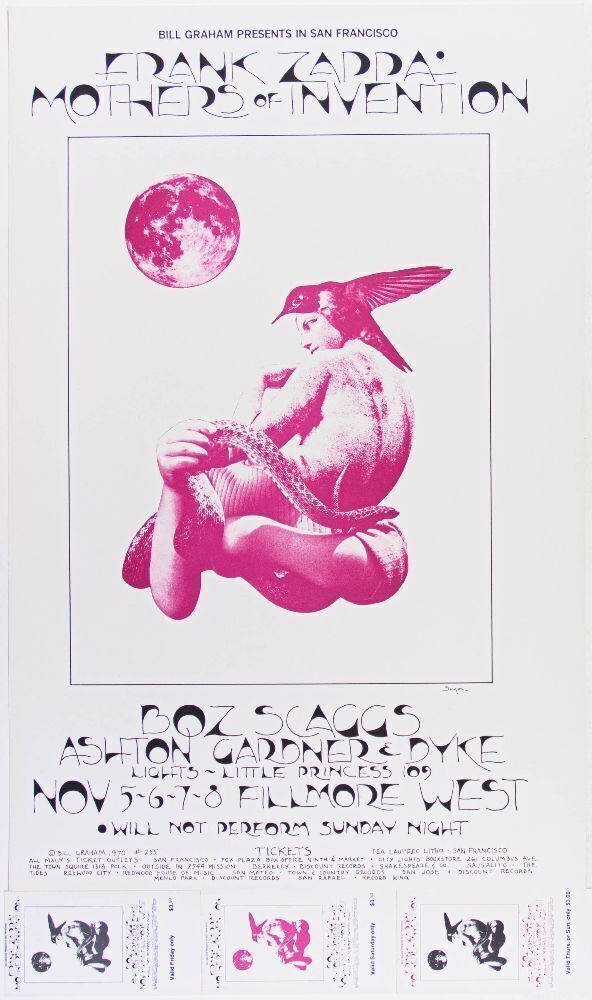 Frank Zappa collectibles are always hotly competed for by collectors worldwide who appreciate this unique artist. This Fillmore West poster is as unique as the artist himself! Boz Scaggs, Ashton Gardner & Dyke were in support during this 1970 run of shows, and collage master David Singer designed this concert poster. This lot also includes three original tickets from the events featuring the same stunning artwork.