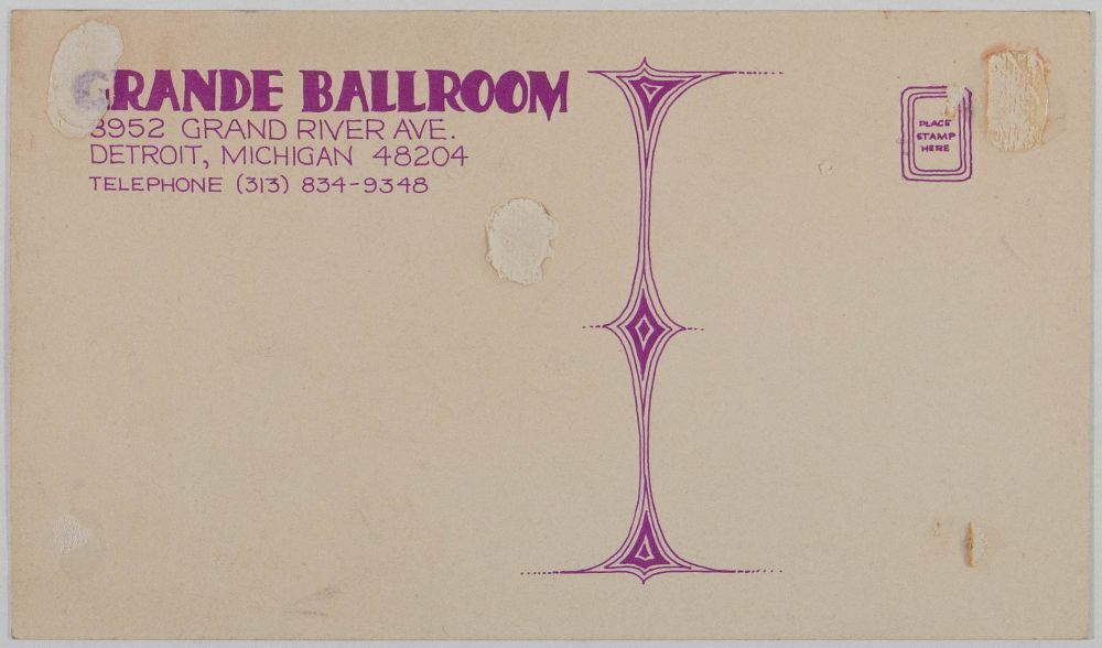 Artist Gary Grimshaw designed this Original Postcard for Cream in Detroit, spring of 1968. There were no known posters created for this event. Very few bands of the era had the strong impact the influential Power Trio Cream did. At their height, they were considered the top Psychedelic Blues band. The Grande Ballroom series produced some of the finest imagery from the 1960s music scene. In many cases, promoter Russ Gibb only produced postcards to promote events. That being the case, Grande cards and card sets have become one of the most highly sought-after items by serious collectors!