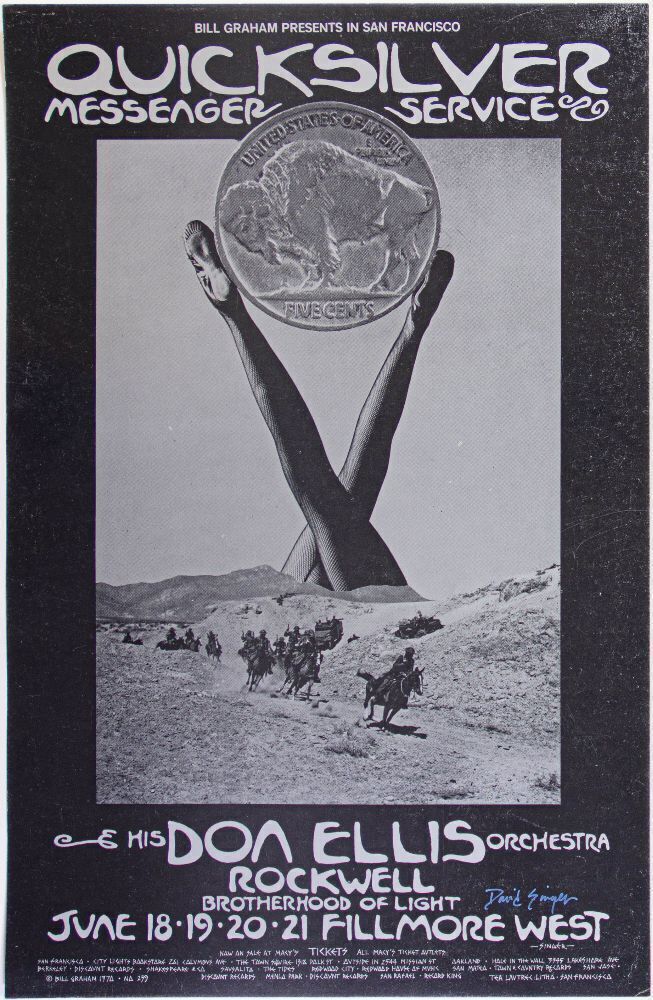 This poster for a June 1968 Fillmore West appearance of Quicksilver is another gem from the desk of David Singer. The artist's use of juxtaposed images is the true fun of this art. Here we have Rockettes/burlesque legs holding a Buffalo nickel in an old west setting. We've only offered this poster in our auction a handful of times over the years!