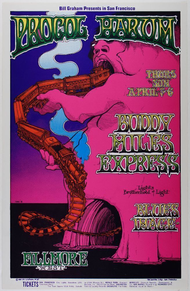 The BG-167 original poster features Procol Harum, the Buddy Miles Express and Blues Image at the Fillmore West during Spring of 1969. Artist Greg Irons was one of the great unsung heroes of the 1960s psychedelic art scene. Irons was a master underground comix, poster, and tattoo artist. His style was perfect for each of those mediums.