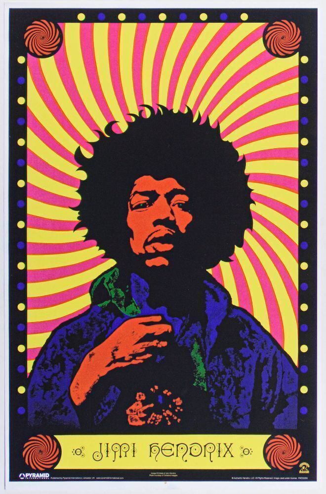 This commemorative silkscreen poster of Jimi Hendrix was distributed by Pyramid International and the Hendrix Estate in 2010, and is a reprint of a beloved headshop poster from 1969. The designer is unknown, but the art is based on the famous photo of Jimi taken by Donald Silverstein and is easily one of the most recognizable images of Hendrix. The vibrant and colorful swirls glow beautifully.