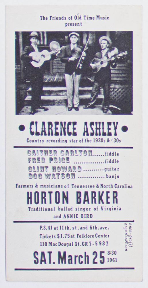 This rare handbill announced an event presented by The Friends of Old Time Music at P.S. 41 in Greenwich Village, New York City on March 25th, 1961. The show featured Clarence Ashley, a country recording star of the 1920s and 1930s, accompanied by Gaither Carlton, Fred Price, Clint Howard, and the great Doc Watson. Horton Barker and Annie Bird filled out the bill. Though Ashley's heyday of popularity was decades before this event, the folk music revival of the late 1950s and early 1960s led to a rediscovery of his music. He toured throughout the decade until his death in 1967.