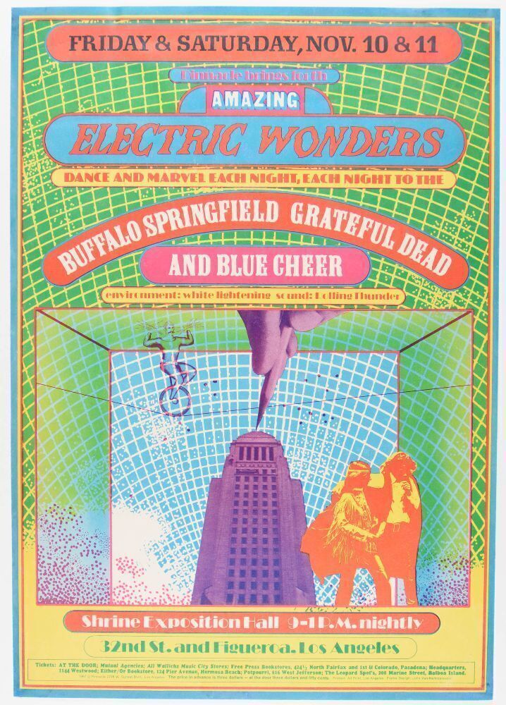 Amazing Electric Wonders poster is a PAE favorite! The poster dates from November 1967 and was the first in a series of events staged by Pinnacle Productions. The show featured two nights of high-energy performances by the Grateful Dead, Buffalo Springfield, and Blue Cheer.
