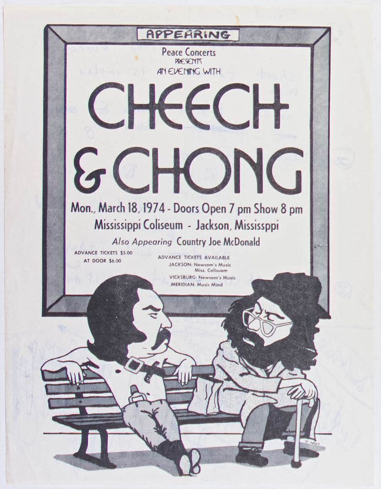 This flyer announced the legendary stoner comedy duo Cheech & Chong appearing at the Mississippi Coliseum on March 18th, 1974. We've never offered another example in our auction!