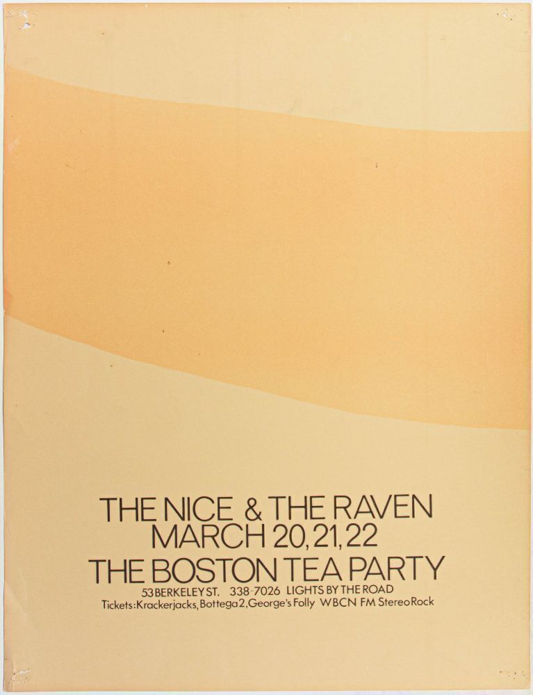This rare issue was produced for The Nice and The Raven, appearing at the Boston Tea Party for three nights in March 1969. The Boston Tea Party venue is one of those pockets of poster collecting that frustrate collectors and dealers alike. The print runs were minuscule, so the survival rates are painfully low. The hottest pieces were absorbed into top collections decades ago and rarely come up for sale. There is no official cataloging reference material for the venue that we are aware of.