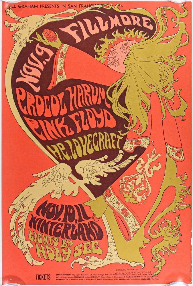 This run of shows at the Fillmore and Winterland during early November of 1967 featured the Syd Barrett-era Pink Floyd and the new band Procol Harum. These were the first shows for the British-based Procol Harum, and the band credited The Fillmore with helping to create their style. In addition, Pink Floyd had actually been booked at the venue a couple of weeks prior, at the end of October (BG-90), however, those shows were canceled and rescheduled for this November run because the US Immigration authorities delayed the issue of their work permits.