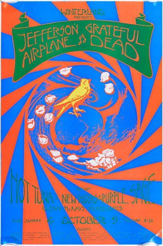 This rare David Singer issue was produced for a two-day run at Winterland on October 4th and 5th, a Sunday and a Monday, in 1970. The bill included Jefferson Airplane, Grateful Dead, Hot Tuna, and New Riders of the Purple Sage. However, though not listed, the New Riders were replaced with Quicksilver Messenger Service. All four bands had released studio albums within the year: The Dead's Workingman's Dead, The Airplane's Volunteers, Quicksilver's Just for Love, and Hot Tuna's debut self-titled LP.
