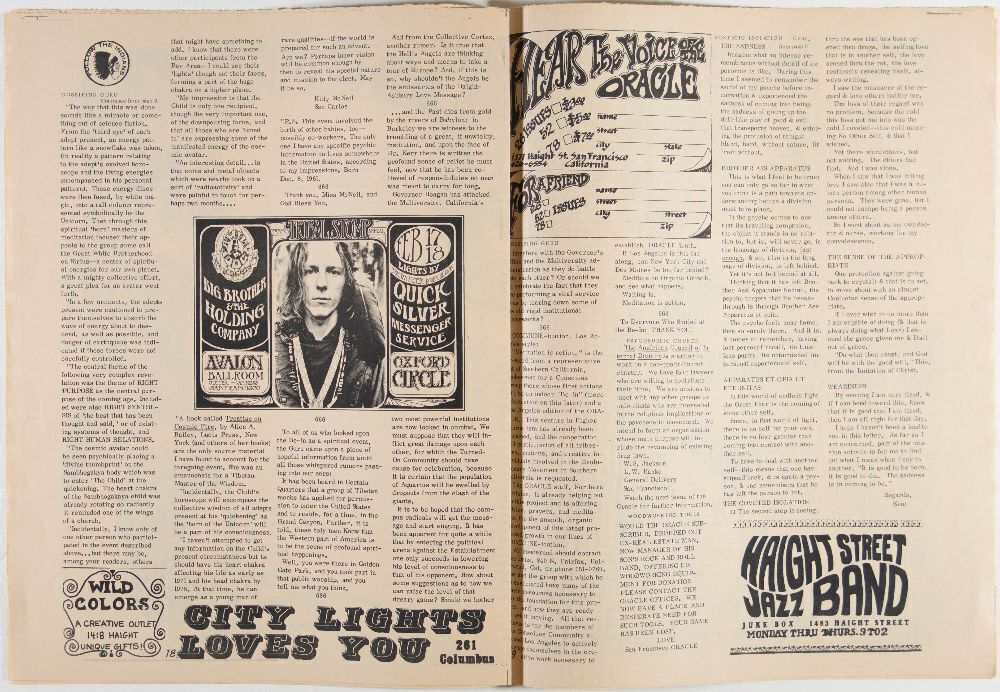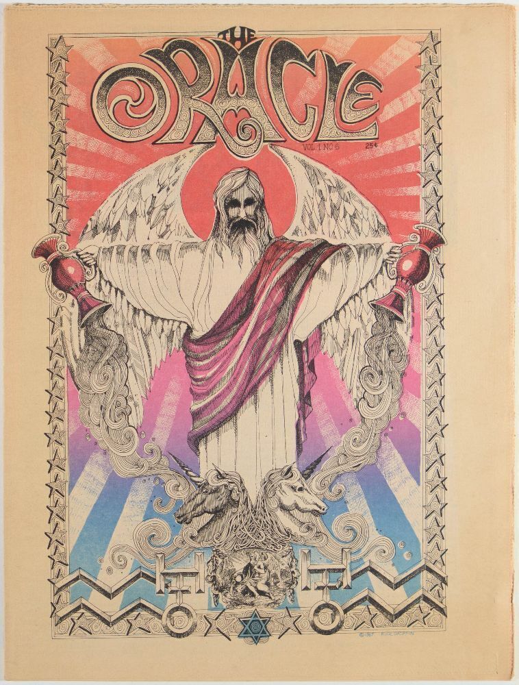 The San Francisco Oracle was an underground newspaper that published 12 issues between September 1966 and February 1968. It was distributed in the Haight Ashbury area and was an early member of the UPS (Underground Press Syndicate). It combined poetry, spirituality, and multicultural interests with psychedelic design reflecting on the counter-cultural community. Many issues had ads for music and records. The Oracle is the most famous and collectible of any underground paper. Contributors included many significant San Francisco area artist,s including the late great Rick Griffin. It also featured such beat writers as Allen Ginsberg, Lawrence Ferlinghetti, and Michael McClure.