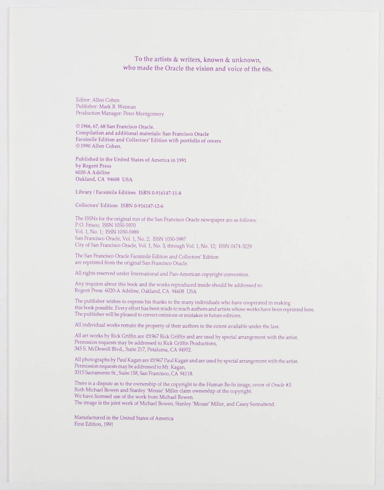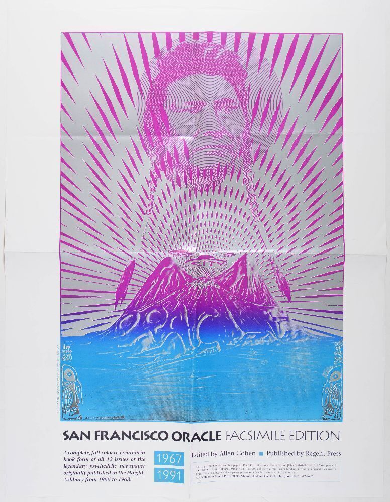 The San Francisco Oracle was an underground newspaper that published 12 issues between September 1966 and February 1968. It was distributed in the Haight Ashbury area and was an early member of the UPS (Underground Press Syndicate). It combined poetry, spirituality, and multicultural interests with psychedelic design reflecting on the counter-cultural community. Many issues had ads for music and records. The Oracle is the most famous and collectible of any underground paper. Contributors included many significant San Francisco area artists, including the late great Rick Griffin. It also featured such beat writers as Allen Ginsberg, Lawrence Ferlinghetti, and Michael McClure. This hardbound book combines all 12 issues and was published in 1991 by Regent Press.