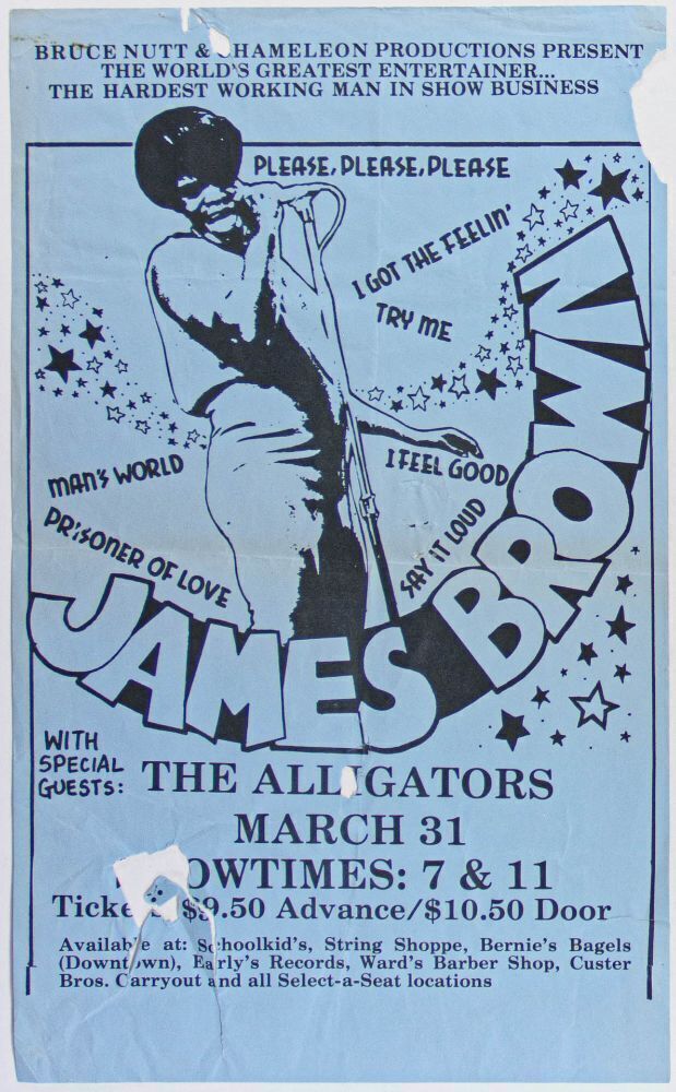 This large-sized flyer announced James Brown at Veterans Memorial Auditorium in Columbus, Ohio on March 31st, 1966. Though his debut LP had been released less than a decade prior, Brown was already ten albums deep into his career. The ever prolific songwriter would release four more albums in 1966 alone, including "Mighty Instrumentals", "James Brown Plays New Breed (The Boo-Ga-Loo)", "James Brown Sings Christmas Songs" (his first Christmas album), and "Handful of Soul". It wasn't until the following decade that Brown earned his title of "Godfather of Soul". Brown continued performing for the next 40 years, up until his death in 2006.