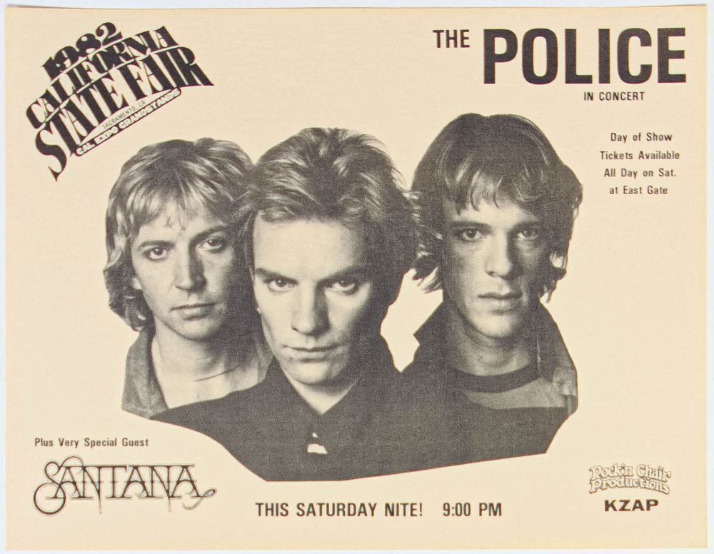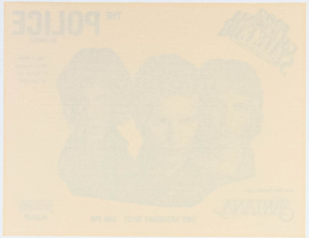 A fantastic twin lineup is showcased on this original flyer. The Police were in the middle of their massive Ghost in the Machine tour, which included North & South America as well as 28 dates in Europe. This single-day festival in California featured The Police headlining with the opening act Santana!
